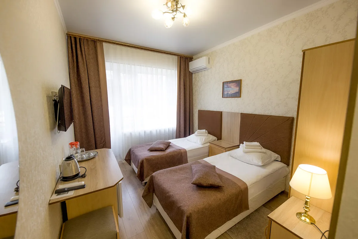 Номер «2-местный 1-комнатный» (1 категории) расположен в корпусе № 4 санатория «Димитрова» Кисловодск. Общая площадь –12 кв. м. Отличается повышенным уровнем комфорта. Красивый интерьер, современная мебель, вся необходимая электрическая бытовая техника делает отдых в санатории приятным и беззаботным. Комната условно разделена на зону для сна и для дневного отдыха. Также есть небольшая прихожая и ванная комната. Гостям предоставляются индивидуальные наборы косметических средств, полотенца. Данный номер для двоих идеально подходит для семейного отдыха или романтического отпуска. В номере царит приятная расслабляющая атмосфера. С балкона открывается неповторимый вид.